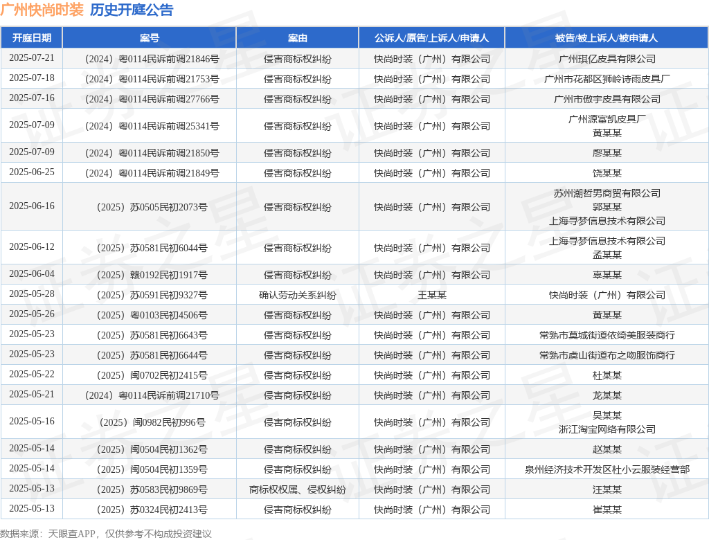 案号:(2025)苏0324民初2413号审理法院:睢宁县人民法院案由:侵害商标权纠纷当事人信息: 原告/上诉人:快尚时装(广州)有限公司 被告/被上诉人:崔某某开庭日期:2025年5月13日根据统计,近一年内以快尚时装(广州)有限公司为当事人的历史开庭公告有244则,其中案由为“侵害商标权纠纷”的公告以201则居首,其次为“商标权权属、侵权纠纷”有13则,“不正当竞争纠纷”有5则。历史开庭公告(前20条)如下:
